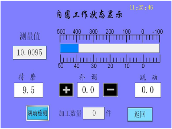 當(dāng)各種數(shù)值都設(shè)定好后,在“加工中操作面板”點(diǎn)擊“啟動(dòng)”按鈕,便進(jìn)入自動(dòng)測量狀態(tài)(儀器上電時(shí)自動(dòng)進(jìn)入)。外徑與內(nèi)徑對(duì)應(yīng)不同的工作狀態(tài)顯示界面,分別如下圖所示: